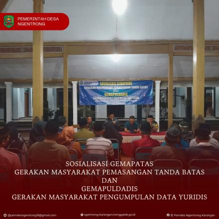 Hari Rabu tanggal 03 Desember 2025 dilaksanakan Sosialisasi GEMAPATAS (Gerakan Masyarakat Pemasangan Tanda Batas) dan GEMAPULDADIS ( Gerakan Masyarakat Pengumpul Data Yuridis ) 2025 adalah gerakan dari Pemerintah desa Ngentrong melanjutkan dari Kementerian ATR/BPN bersama masyarakat untuk meningkatkan kesadaran akan pentingnya pemasangan tanda batas tanah guna mengamankan aset dan kepastian hukum. Tujuannya adalah mencegah sengketa tanah dan mendukung program Pendaftaran Tanah Sistematis Lengkap (PTSL).